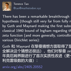 新的突破来自 MIT 数学教授 Larry Guth 和牛津大学数学研究所教授、菲尔兹奖得主 James Maynard 的一篇论文。推荐该论文的数学家陶哲轩表示,他们对黎曼 zeta 函数零点的经典 1940 年 Ingham 界限进行了首次实质性改进(更广泛地说,是控制各种狄利克雷级数的大值)。此前,诞生已超过 80 年的 Ingham 界限由于缺乏改进,限制了数学家在解析数论中做很多事情。