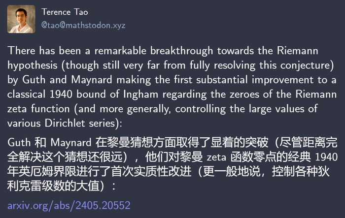 对于 Guth 和 Maynard 的新突破,知名数学家陶哲轩评价道:「Guth 和 Maynard 在研究黎曼猜想方面取得了重要进展,尽管离解决这一历史悠久的数学问题还有很长的路要走 。」