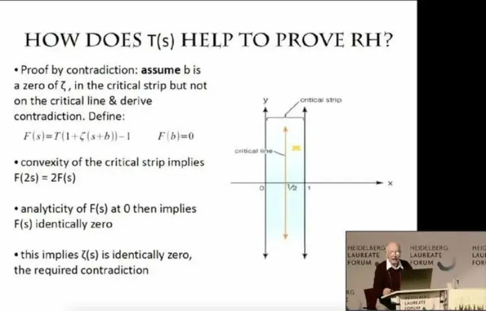 不过阿蒂亚爵士的证明只有以下一页 PPT。这样的证明,似乎无法让人信服。当被问及是否解决了黎曼猜想时,他回应称,「这是由你的逻辑决定的。原始的黎曼猜想我是证明了,除非你是那种不接受反证法的数学家。」他也补充说,其证明没有解决所有问题,后续还有很多问题,自己只是走了第一步(第一步就是解决方案)。