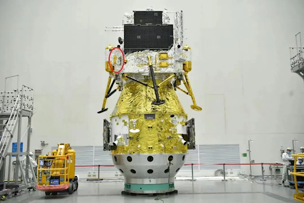 在嫦娥六号奔月和落月过程中,这台小机器人一直被悬挂在着陆器的侧板外。