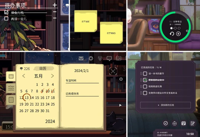 除了音乐和画面营造的工作氛围,它们还内置了待办事项列表、番茄钟、签到日记、笔记本、便利贴等常用的生产力工具。仅从这些功能来看,足以把它们分类到生产力APP中去。
