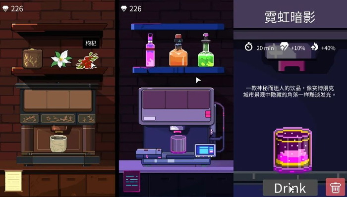 每个场景中,玩家还可以在屏幕右侧找到一个调酒吧台——像一个极简版《赛博酒保行动VA-11 Hall-A》,花费钻石购买不同配料调制出不同的饮品,为经验和钻石的获得效率加上BUFF。
