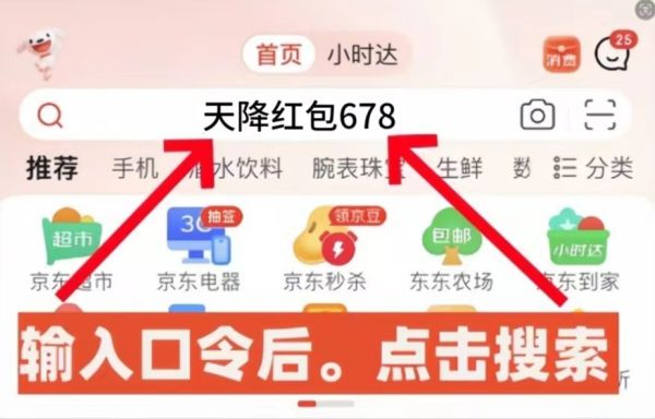 红包口令:今年京东的红包口令为「天降红包678」,通过手机京东APP搜索该口令可领取红包。红包的大小与搜索的口令相关,因此记得每天去领,可以增加购物的优惠。