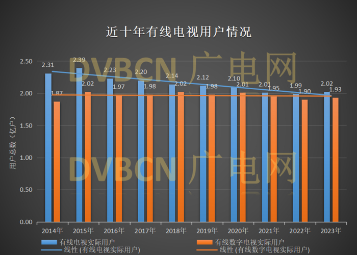 以广电总局发布的2023年全国广播电视行业统计公报为准的话,去年全国有线电视实际用户2.02亿户,其中,有线电视双向数字实际用户1.00亿户。而2022年全国有线电视实际用户2.00亿户,有线电视双向数字实际用户9820万户。