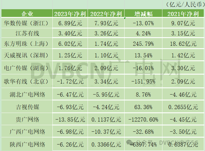 有三家企业净利由盈利转为了亏损,为北京歌华有线、贵州的贵广网络、陕西广电网络,歌华有线是成立二十多年来首次净利亏损;