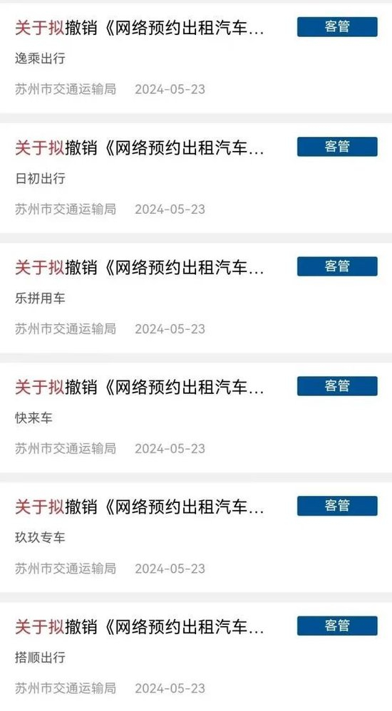 5月17日,苏州发布公告拟撤销逸乘出行、日初出行、乐拼用车、快来车、玖玖专车等7家网约车平台的经营资质,这些网约车平台都是在执法检查中发现,不具备线下服务能力。