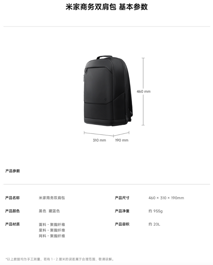 小米米家商务双肩包采用简约立体设计,使用拼接防泼水面料,提供藏蓝色和黑色两种配色。