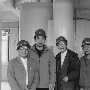 郭慕孙(右二)、李佑楚(左一)与同事在车间合影。