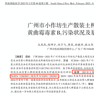 反倒是土榨油,生产条件简陋,比如生产花生油主要靠人工挑选霉变的花生,难免疏忽,再加上后面没有精炼工艺,所以就容易黄曲霉毒素超标。像下面这个研究,对广州小作坊生产的 203 土榨花生油进行了检测,结果 76.85% 检出了黄曲霉毒素,而且 9.85% 还超标了。