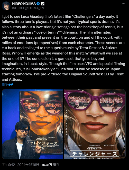 近日,小岛秀夫在社媒发文分享了影片的观后感: