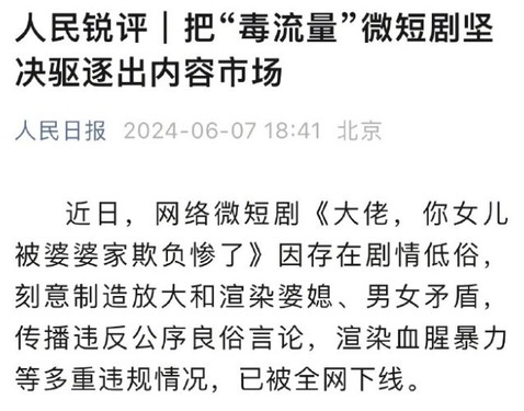 人民日报锐评:把毒流量微短剧坚决驱逐出内容市场