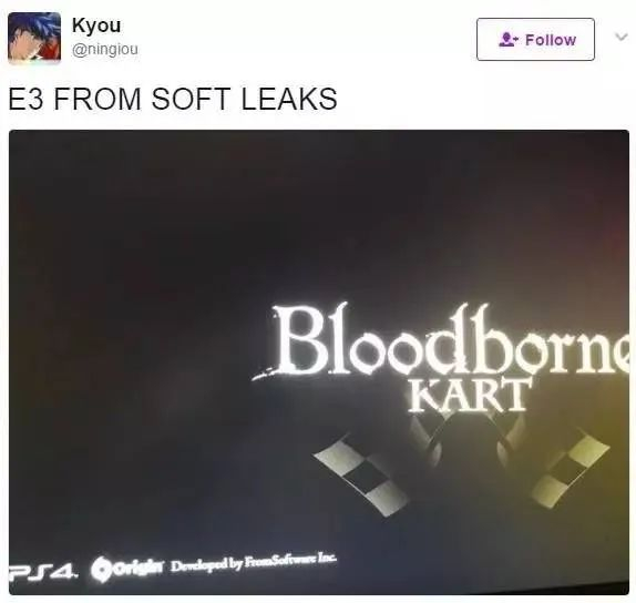 《血源卡丁车》的创意来源最早可以追溯到2017年,一位名叫Kyou的用户在推特上发布了关于FromSoftware的E3传闻,还附上了一张仿佛盗摄的屏幕图——《血源卡丁车》(Bloodborne Kart)。