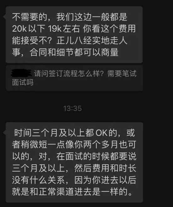 杜宇告诉中新经纬,据她了解,中介给企业内部员工的介绍费报酬都是几千元,甚至上万不等。线下入职5000元/人,线上入职3500元/人,留学生推荐信邮件1500元/人,面试辅导800元/人。