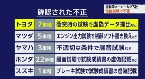 日本国土交通省日前通报说,丰田、马自达、雅马哈发动机、本田、铃木5家日本车企在量产认证申请过程中存在违规操作和舞弊行为。上述日本车企生产的38种车型存在认证欺诈问题,其中32款已停产。