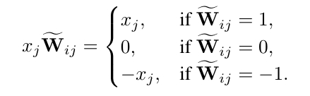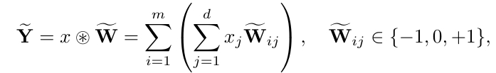 由于三值化权重只能从 {−1, 0, +1} 中取值,因而 MatMul 中的乘法运算可以用简单的加法或减法运算代替: