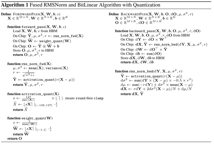 算法 1 为量化融合 RMSNorm 和 BitLinear 算法的流程图: