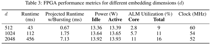 通过使用完整的 512 位 DDR4 接口,并对占据核心处理时间 99% 的 TMATMUL 功能单元进行并行化,预计在保持相同时钟速率的情况下,无需额外优化或流水线化,可以实现大约 64 倍的进一步加速,如表 3 所示。