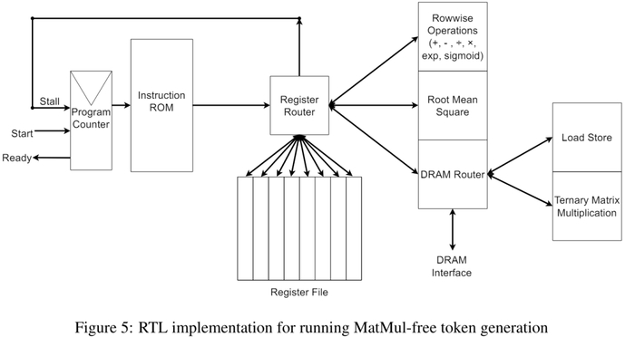 为了测试MatMul-free语言模型功耗和有效性,研究人员使用 SystemVerilog 创建了一个 FPGA 加速器。概览如图 5 所示。