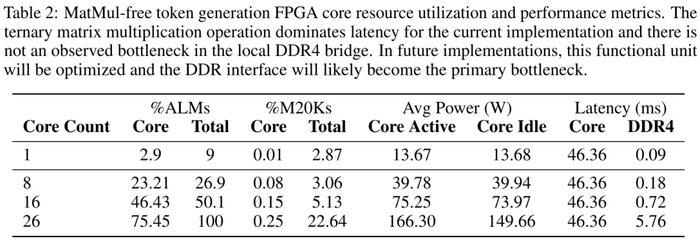 最后,研究者在 FPGA 上构建了一个自定义硬件解决方案,他们以 13W 的功耗处理了十亿参数规模的模型,超出了人类可读的吞吐量,使 LLM 更接近大脑般的效率。