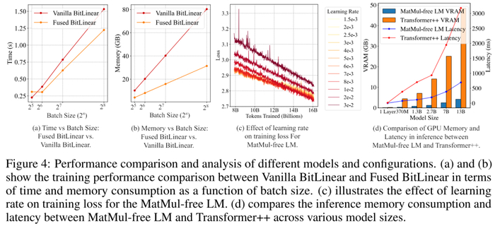 研究人员根据训练时间和内存使用情况评估了他们提出的融合型 BitLinear 和传统型 BitLinear 实现,如图 4 (a-b) 所示。
