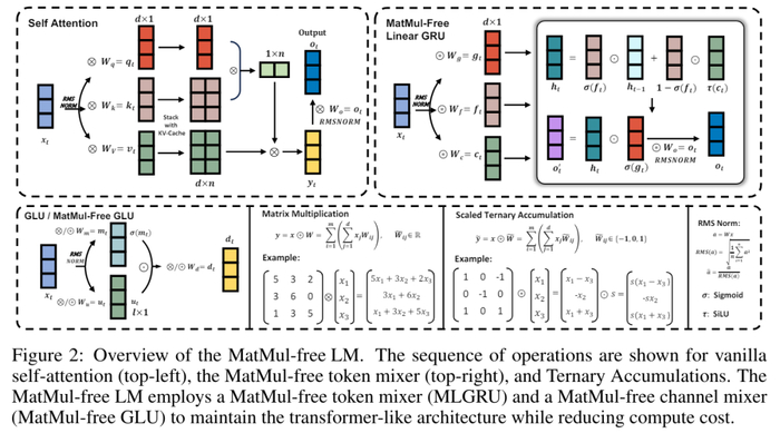 具体来说,三值权重消除了密集层中的 MatMul,类似于 BNN。为了从自注意力中移除 MatMul,该研究优化了门控循环单元 (GRU) ,使其仅依赖于元素级乘积,并表明该模型可与最先进的 Transformer 相媲美,同时消除了所有 MatMul 运算。
