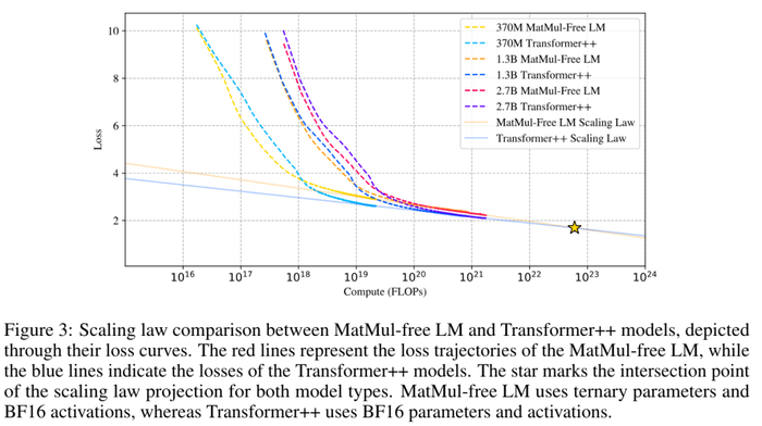 此外,论文还研究了扩展定律,发现随着模型规模的增加,MatMul-free 模型与全精度 Transformer 之间的性能差距逐渐缩小。