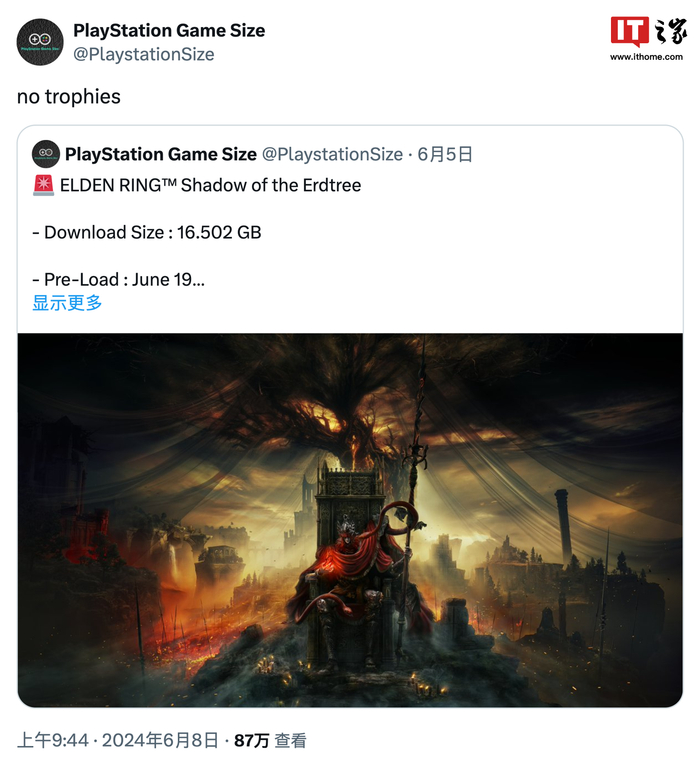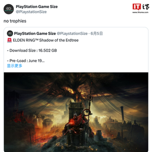 IT之家 6 月 9 日消息,据博主 PlayStation Game Size 爆料,《艾尔登法环》DLC “黄金树幽影”的 PS 版下载大小为 16.502 GB,将于 6 月 19 日开启预下载。