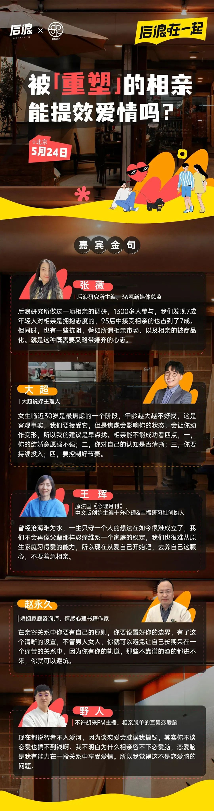 5月24日下午,“后浪研究所”联合北京SKP举办了一场关于相亲的线下沙龙,探讨“被重塑的相亲,能否提效爱情?”我们邀请了大超说媒的主理人大超,十分心理&幸福研习社创始人王珲,心理咨询师、婚姻家庭咨询师赵永久,不许胡来FM主播野人和后浪研究所主编薇薇子一起围绕该议题展开讨论。