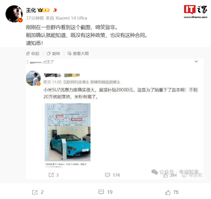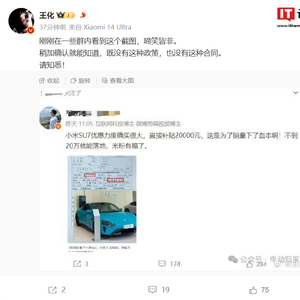 IT之家 6 月 10 日消息,有传闻称小米 SU7 优惠力度很大,直接补贴 20000 元,20 万就能落地。对此,小米集团公关部总经理 @王化 转发该消息并辟谣称:“刚刚在一些群内看到这个截图,啼笑皆非。稍加确认就能知道,既没有这种政策,也没有这种合同。请知悉! ”
