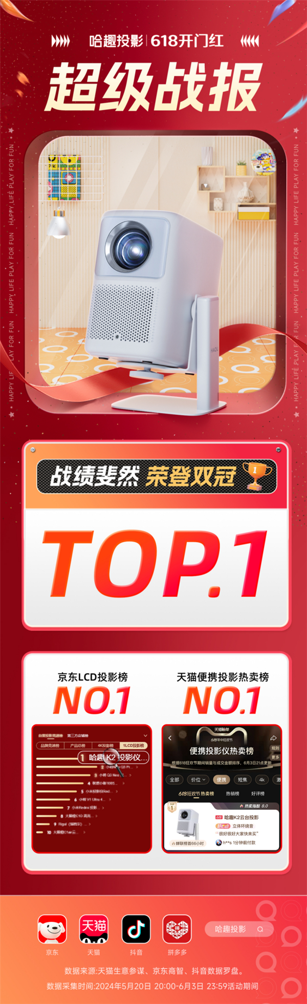 一举拿下天猫京东双TOP1!618哈趣投影开门红