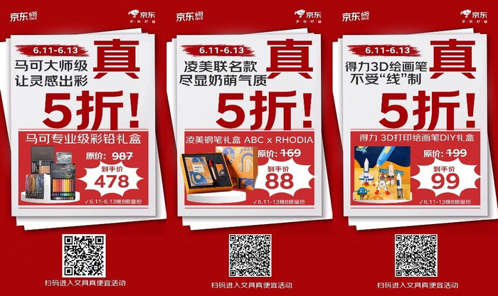 品质更出众的大牌文具更值得入手。马可大师系列专业100色水溶彩色铅笔,浓郁的色彩表现力,可以很好地表现出颜色之间的微妙变化。日常价987元,6月11日起京东文具低至5折优惠,到手价478元。凌美ABC联名钢笔套装,硬枫木的笔杆有着温柔的质感,专为孩子打造,奶萌气质尽显。日常价169元,6月11日开始京东文具享5折优惠,到手价88元。得力3D打印绘画笔DIY礼盒,让孩子尽情创作,把天马行空的想象力变成眼前的实物,日常价199元,6月11日开始京东文具享5折优惠,只需99元。