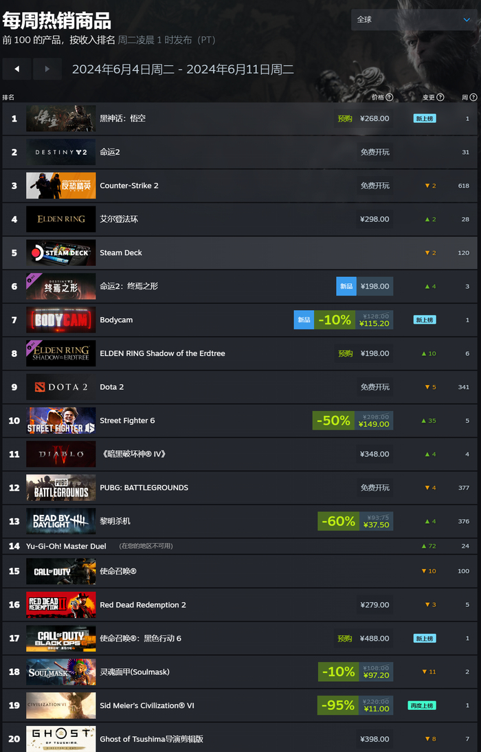 《黑神话:悟空》预购首周全球登顶,Steam 最新一周销量榜公布