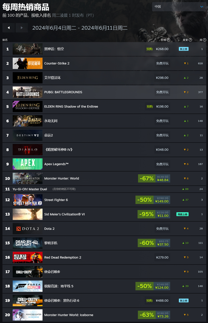 IT之家 6 月 11 日消息,Steam 最新一周销量榜出炉(2024 年 6 月 4 日-2024 年 6 月 11 日),《黑神话:悟空》6 月 8 日开启预购成功登顶,包揽全球、国区、港区的周榜第一。