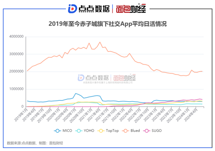 点点数据显示,2019年至今,Blued的平均日活虽有所下降,但仍然是该公司最活跃的社交平台。