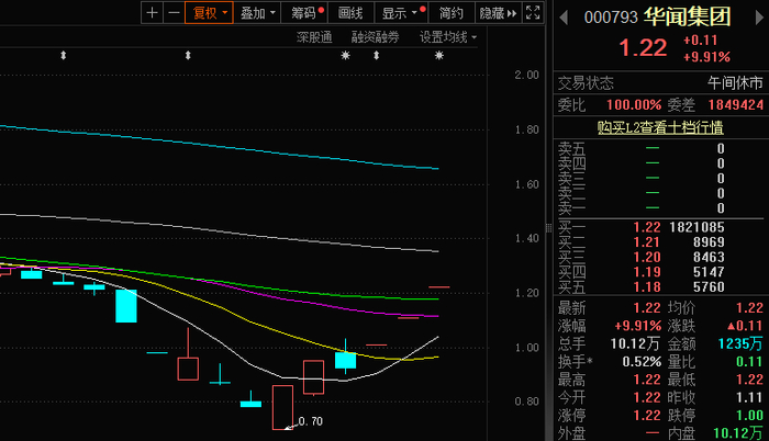 不过在6月7日,该股早盘集合竞价时就被涌入的大量买单顶在涨停板位置,致使其“一字涨停”开盘,涨停价为1.01元,恰好高于1元。随后两个交易日,华闻集团也实现一字涨停。截至6月12日午盘,华闻集团涨9.91%,报1.22元/股,买一位置仍有182万手封单。
