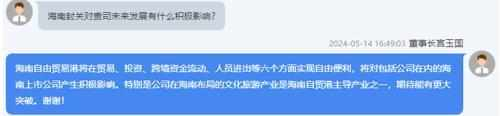 此前曾有投资者在公司业绩说明会上提问:“海南封关对公司未来发展有什么积极影响?”华闻集团董事长宫玉国回复称,海南自贸港将在贸易、投资、跨境资金流动、人员进出等六方面实现自由便利,将对包括华闻集团在内的海南上市公司产生积极影响,特别是公司在海南布局的文化旅游产业是海南自贸港主导产业之一,期待能有更大突破。
