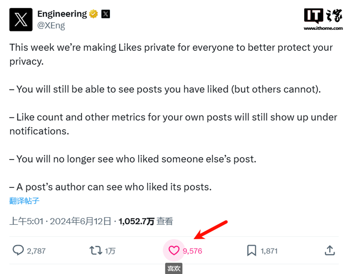 IT之家 6 月 12 日消息,X(推特)平台今日官宣,本周将把“点赞”功能对所有人保密,以便更好地保护用户隐私。