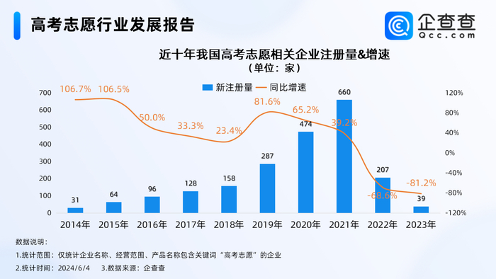 注册量方面,2014年至2021年,我国高考志愿相关企业注册量逐年增加,从2014年的31家,逐年递增至2021年的660家;后受教培行业遭遇强监管影响,注册量连续两年腰斩,2022年、2023年高考志愿相关企业注册量分别同比减少68.6%、81.2%至207家、39家;2024年前五个月,国内已注册21家。