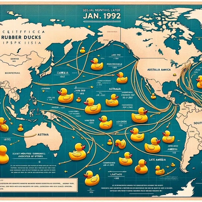 1992 年的某一天,一艘名为“Ever Laurel”的货轮航行在香港与美国之间时遭遇了一场意外风暴。风暴的力量将装有 28800 只塑料小黄鸭的集装箱投入了太平洋的怀抱,这些小黄鸭们将伴随着洋流开启一场奇妙的探险之旅。