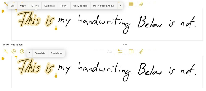 用户在快速书写的时候,线条可能会弯曲而不平行。苹果提供了一个“Straighten”(拉直)文本的选项,使线条从右到左更直。