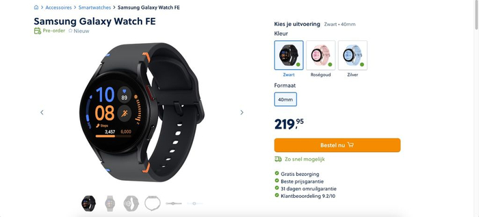 IT之家 6 月 13 日消息,荷兰电商平台 Mobiel.nl 偷跑上线三星 Galaxy Watch FE 智能手表,售价为 219.95 欧元(IT之家备注:当前约 1723 元人民币),共有黑色、玫瑰金色和银色(搭配浅蓝色表带)三种颜色,表盘尺寸为 40mm,运行 Wear OS 系统。