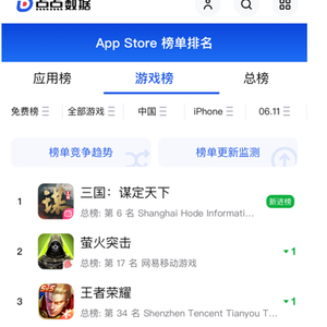 6月13日,《三国:谋定天下》开启公测。点点数据显示,该游戏公测当天位列中国地区App Store游戏免费榜总榜第二名。