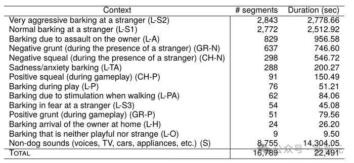 使用与刺激相关的信息手动注释每个生成的片段。下表显示了14种狗的发声类型以及相应的段数和持续时间: