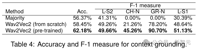 实验结果如下表所示。与之前的实验类似,两种Wav2Vec2模型的表现都优于基线(Majority),而预训练版本获得了最准确的结果。
