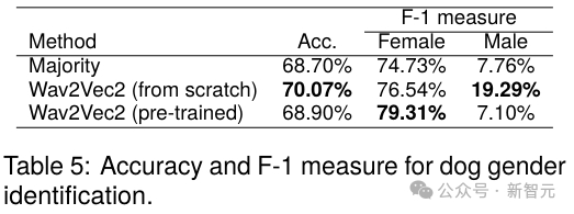 结果如下表所示。这次是从头开始训练的Wav2Vec2模型表现更好,而预训练模型对女性类别有一些改进,可能是因为狗狗数据集中母狗的数据比较多(按总持续时间计算,母狗为67.95%,公狗为32.04%)。