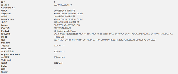 5 月 13 日,小米有一款型号为 2407FRK8EC 的手机新品通过了国家 3C 质量认证入网,结合之前曝光的信息来看就是小米即将发布的 Redmi K70 Ultra。