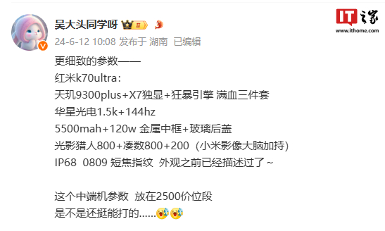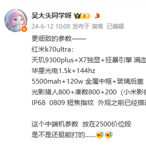 IT之家 6 月 13 日消息,6 月 12 日,博主 @吴大头同学呀 曝光了一组小米 Redmi K70 Ultra 手机的主要参数,大家可以参考一下。