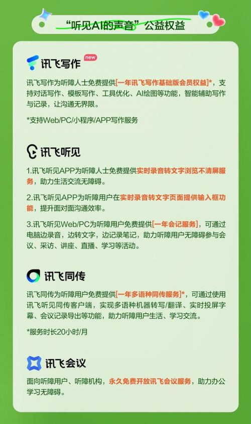 今年,“听见AI的声音”为听障群体带来了更多的免费产品权益,包含讯飞写作、讯飞听见APP、讯飞听见会记、讯飞同传、讯飞会议等诸多免费使用时长及转写权益等,变听为看、看听结合,建立起听障群体与社会沟通的桥梁,让他们更好地“听见”世界,同时也被这个世界“听见”。
