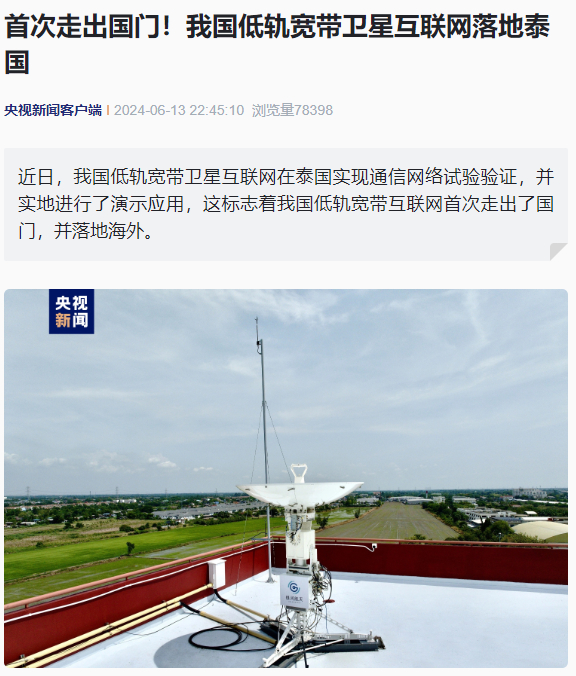 IT之家 6 月 13 日消息,据央视新闻客户端消息,近日,我国低轨宽带卫星互联网在泰国实现通信网络试验验证,并实地进行了演示应用,这标志着我国低轨宽带互联网首次走出了国门,并落地海外。