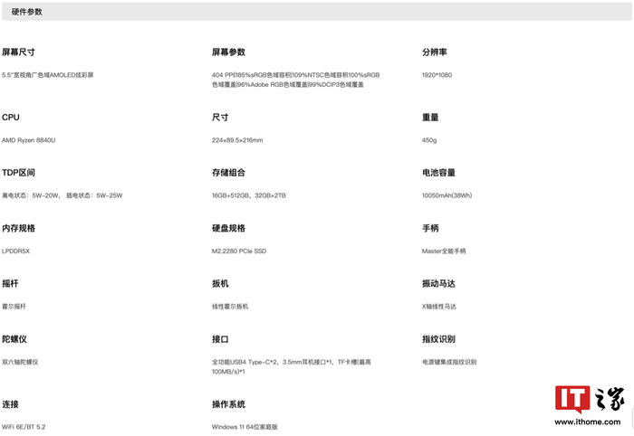 IT之家附 AYANEO AIR 1S 8840U 百英雄传联名款掌机硬件参数及售价信息如下: